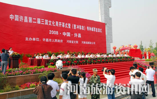 6 月 1 日上午 9 點整,許昌許都公園彩旗飄飄,熱鬧非凡,一場聲勢浩大的三國文化盛宴——中國許昌第二屆三國文化周開幕式暨《曹沖稱象》特種郵票首發(fā)式在這里隆重舉行。出席三國文化周開幕式的主要領(lǐng)導(dǎo)有中國郵政集團公司副總經(jīng)理馮新生,省政協(xié)副主席靳綏東,中國文聯(lián)主席團委員李前光,中國郵政集團公司郵政業(yè)務(wù)局副總經(jīng)理李永明,省文聯(lián)黨組書記吳長忠,省郵政管理局局長楊漢振,省郵政公司總經(jīng)理楊海福,省文化廳副廳長崔為工,省旅游局紀檢組長周保建,省文聯(lián)副主席、省民間藝術(shù)家協(xié)會主席夏挽群,省郵政公司副總經(jīng)理張力揚等。另外,廣大中外學(xué)者教授、新華社、《人民日報》、《光明日報》等知名記者也參加了本屆文化周開幕式。開幕式由許昌市副市長秦春梅主持,許昌市人民政府市長李亞致辭,李永明代表中國郵政集團公司郵政業(yè)務(wù)局宣讀了《曹沖稱象》特種郵票發(fā)行通知,楊海福代表河南省郵政公司講話。馮新生、靳綏東、李前光、毛萬春共同為《曹沖稱象》特種郵票揭幕。靳綏東宣布中國許昌第二屆三國文化周開幕。