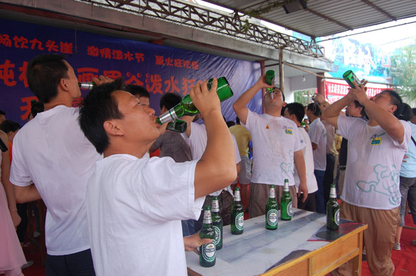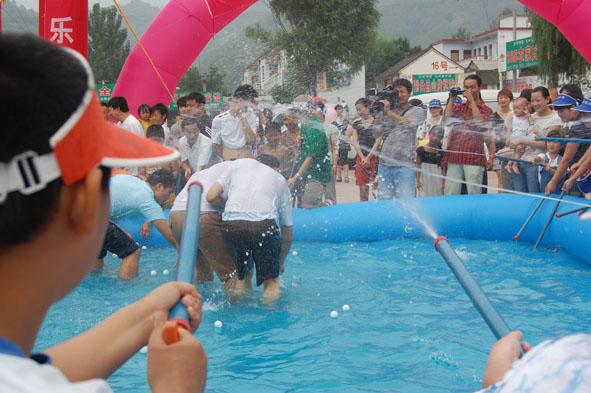 上午9時(shí)30分,魯山縣旅游局局長(zhǎng)申松陽(yáng)宣布狂歡節(jié)開幕。開幕式上,水中撈乒乓球、喝啤酒、吃西瓜、水槍激戰(zhàn)等競(jìng)賽游戲,高潮迭起,精彩不斷。瞬間,時(shí)間停留在歡樂(lè)的海洋中,人們忘卻年齡、性別、身份,盡情潑灑潔凈的圣水,相互祝福。