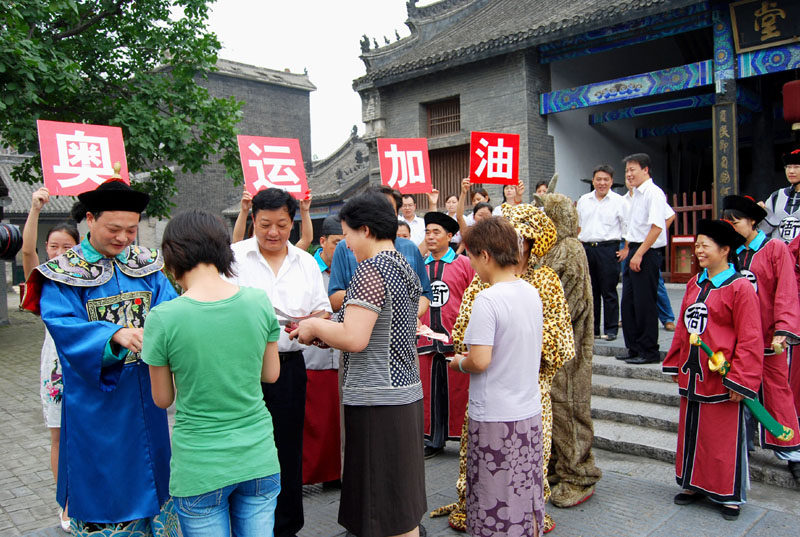 我省開封奧運火炬手、曾以《一個記者眼中的寶天曼》而蜚聲省內(nèi)外的河南日報首席記者王天定,帶著對內(nèi)鄉(xiāng)旅游的真情與厚愛,7月28日來到內(nèi)鄉(xiāng)縣衙,親自策劃“為奧運加油”的宣傳活動?h衙員工身穿官服、寶天曼員工身穿金錢豹、斑羚服,高舉“奧運加油”的牌子。內(nèi)鄉(xiāng)縣政府副縣長、旅游業(yè)領(lǐng)導(dǎo)小組副組長劉超親自為游客發(fā)放景區(qū)迎奧運明信片,為奧運加油祝福。