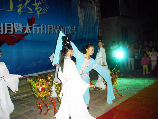 9月14日中秋節(jié)晚上,古老的郭亮村仙樂齊鳴,歌舞升平,圣女祝福、嫦娥起舞,廣大游客和村民共同渡過了一個難忘的高山中秋夜。 拜月儀式由純潔圣女開啟,她用喊泉、瑤池、蓮花盆的圣水向山上的游客灑下祝福。此時,景區(qū)內(nèi)古琴、琵琶齊鳴, 此曲只應(yīng)天上有,人間哪得幾回聞?在明亮的月光下,四位神秘“仙女”持宮燈輕歌曼舞,高山上的郭亮村彷佛成了月亮上的廣寒宮。“嫦娥”向游客撒出的糖果和山花,更是引起了巨大的轟動。