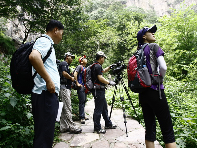 九蓮山景區(qū)集聚了南太行“冷、險、奇、竣”的特點, 8月2日,韓國衛(wèi)星電視“登山頻道”金夀浩部長一行9人走進九蓮山景區(qū)。當金夀浩一行9人走到天壺瀑布下,看到“飛流直下三千尺”的天壺瀑布非常激動,紛紛從不同角度對瀑布、峭壁、青檀樹等,進行拍攝。他們感慨地說:“這瀑布真是太壯觀了。尤其是該瀑布以太行山特有的紅巖地質(zhì)地貌為背景,更是非常獨特!難怪《中國國家地理》稱太行山把最美的一段給了河南!”