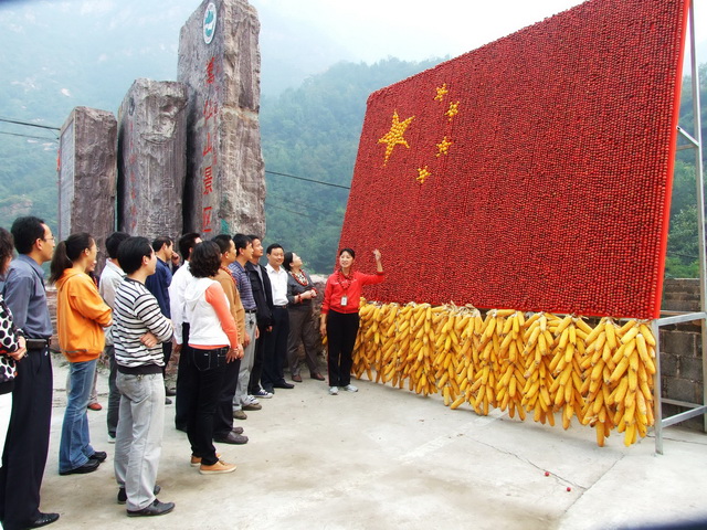 走進萬仙山,一面醒目的,用山楂、玉米、柿子組成的五星紅旗穆然躍入眼瞼,高3米,長4.5米的國旗在優(yōu)美的風(fēng)景區(qū)傲然毅立,前面擠滿了游人,其風(fēng)頭一下遮住了太行的赤壁紅巖,紅、白龍洞、石頭古村、飛泉流瀑在其面前也暗然失色。游客們紛紛在前留念,似以此來表達他們對國家的熱愛與祝福。
