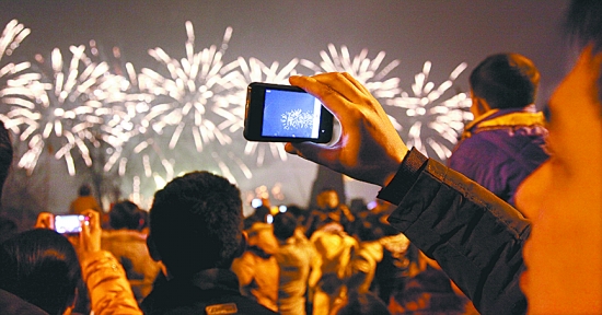 為了留住煙花綻放的美麗瞬間,許多市民拿出手機(jī)拍攝留念。