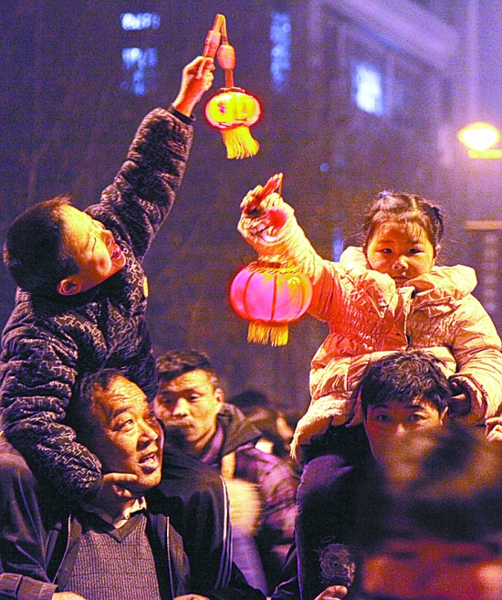 騎在家長(zhǎng)的肩膀上,打著燈籠看煙花,兩位小朋友玩得不亦樂(lè)乎。