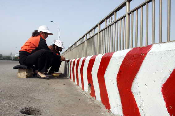 5月3日下午,209國(guó)道澗河橋上,工作人員正在涂刷反光標(biāo)志漆。
