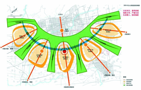 “靈山秀水”指焦作“北依太行,南臨黃河”的自然山水格局;“五彩焦作”指未來的空間有機、產(chǎn)業(yè)發(fā)達、功能復(fù)合、環(huán)境生態(tài)、文化繁榮的以焦作新區(qū)為代表的新焦作。