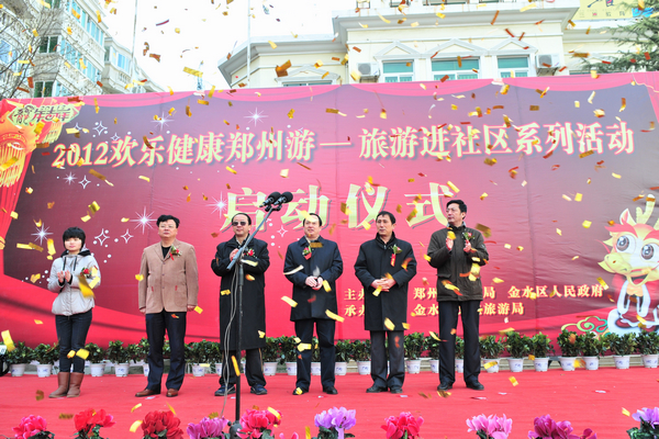 2012年1月3日,為深入落實(shí)國家旅游局“歡樂健康游”主題年,積極響應(yīng)省旅游局“中原人游中原”活動(dòng),由鄭州市旅游局、金水區(qū)人民政府主辦、金水區(qū)文化旅游局承辦的“2012歡樂健康鄭州游——旅游進(jìn)社區(qū)”系列活動(dòng)啟動(dòng)儀式在金水區(qū)富田麗景社區(qū)隆重舉行。市政府副秘書長宋柏松、鄭州市旅游局局長龍同勝、開封市旅游局副局長高新建、鄭州市社區(qū)建設(shè)服務(wù)局副局長霍正欽、金水區(qū)副區(qū)長徐雄、金水區(qū)文化旅游局局長吳兆強(qiáng)參加了此次活動(dòng)。