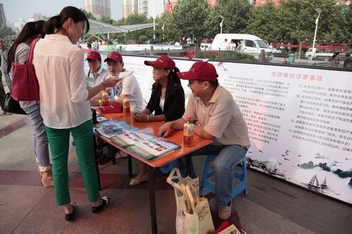 為認(rèn)真貫徹落實(shí)《關(guān)于開(kāi)展2012年全國(guó)“質(zhì)量月”活動(dòng)的通知》和《質(zhì)量發(fā)展綱要》精神,提高全民質(zhì)量意識(shí),推進(jìn)質(zhì)量強(qiáng)國(guó)理念,9月5日上午,三門(mén)峽市旅游局在湖濱廣場(chǎng)設(shè)立政策法規(guī)宣傳咨詢(xún)點(diǎn),宣傳旅游條例、政策法規(guī),接受市民咨詢(xún)。一起參與活動(dòng)的還有中旅、中信兩家旅行社工作人員。