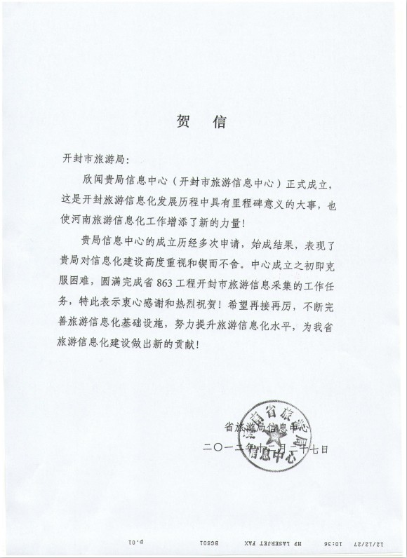 河南省旅游局發(fā)來(lái)賀信,恭祝開(kāi)封旅游信息中心成立且希望再接再厲努力工作。為我省的旅游信息化建設(shè)做出新的貢獻(xiàn)。