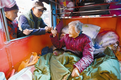 26日下午,車隊(duì)經(jīng)107國道抵達(dá)信陽。在市區(qū),沿途不少市民聽說了他們的事跡,紛紛上前幫忙拉車,一家養(yǎng)生堂的老板周燕女士聞聽此事后,把他們接到了自家店里,免費(fèi)提供食宿。在店里,王銳、謝淑華、馬成銀三人和市民們分享了他們的故事。謝淑華的兩個(gè)兒子事業(yè)有成,平時(shí)出門她都有轎車接送,談起徒步拉車帶母旅游,謝淑華說:“盡孝不講條件,母親一路旅游,心情舒暢,高血壓沒有了。剛開始走,腳上都磨出了水泡,現(xiàn)在我們一天可以走50公里,久而久之,自己的脂肪肝也消失了。”而馬成銀為了帶老父親出門,沒顧上今年的秋收,他認(rèn)為:“盡孝不能等。”聽后,很多人都為之動(dòng)容。二位老人的經(jīng)歷令趕來圍觀的市民們羨慕不已。“說實(shí)話,我都不一定能做到這樣,會(huì)有各種顧慮,有點(diǎn)兒慚愧。”市民吳女士說。