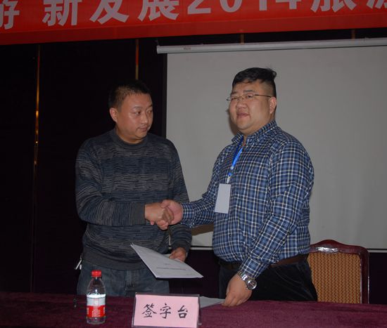 會議中許昌旅行社代表與特邀旅行商代表的負(fù)責(zé)人,上臺簽訂旅游合作協(xié)議。
