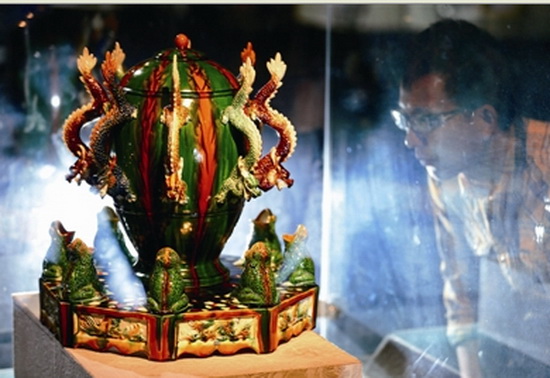 近日筆者在洛陽唐三彩陶藝博物館看到,一件色澤柔和又極富歷史韻味的唐三彩地動(dòng)儀吸引眾多游客的目光。