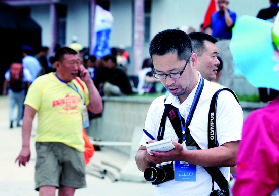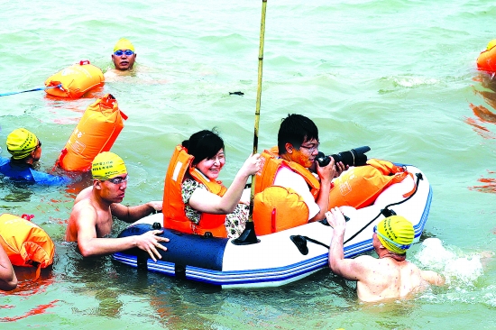 三門(mén)峽日?qǐng)?bào)記者李海峰承擔(dān)橫渡母親河活動(dòng)的圖片、文字雙重任務(wù)