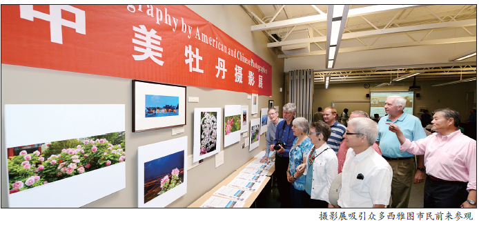步入展廳,首先映入眼簾的是以“國色•牡丹”為主題的10幅洛陽牡丹攝影作品,多方面展示了洛陽牡丹的雍容華貴,吸引了眾多西雅圖市民駐足觀看。“遺產(chǎn)•城市”“君山•雪韻”“交融•時(shí)空”3個(gè)主題的攝影作品,不僅向西雅圖市民展示了洛陽城市建設(shè)、自然山水、文化遺產(chǎn)的精華之處,更通過創(chuàng)意攝影手法表現(xiàn)了東西方文化的交融。
