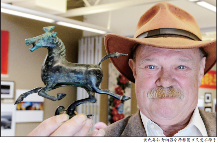 在洛陽(yáng)黃氏粵鈺青銅器展位前,一件洛陽(yáng)生產(chǎn)的馬踏飛燕青銅器讓西雅圖市民愛(ài)不釋手。這件作品的作者是黃氏粵鈺青銅器第十七代傳人黃燁儒,F(xiàn)場(chǎng)的工作人員向參觀者介紹了洛陽(yáng)青銅文化的淵源,并推介了黃氏粵鈺青銅器的相關(guān)產(chǎn)品。