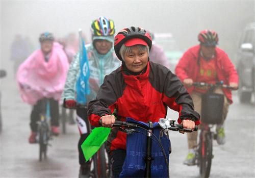 蒙蒙細(xì)雨中騎行的老年朋友