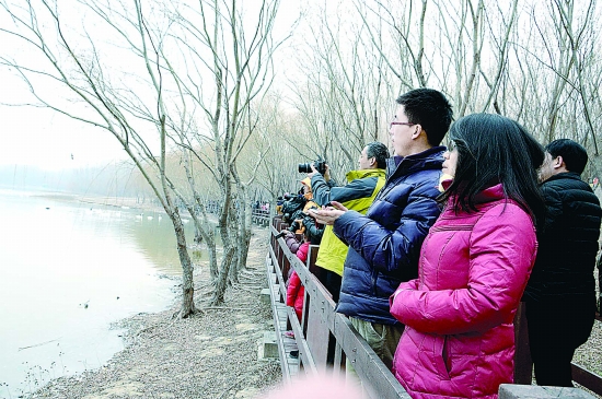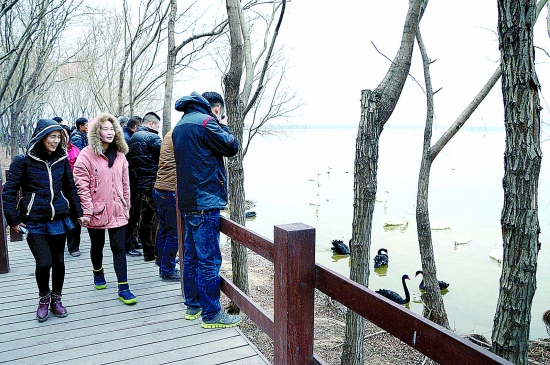 在三門(mén)峽天鵝湖國(guó)家城市濕地公園,嚴(yán)寒阻擋不住人們觀賞白天鵝的熱情。1月2日下午,青龍湖畔人流車(chē)流不斷;湖面上數(shù)千只優(yōu)雅的白天鵝時(shí)而游弋覓食,時(shí)而展翅滑翔;岸上眾多游客或駐足觀賞,或攝影留念。一位來(lái)自安徽合肥的王先生告訴記者,他從媒體上得知三門(mén)峽不但有聞名遐邇的萬(wàn)里黃河第一壩,而且還是觀賞白天鵝的好去處,就和家人一起從合肥出發(fā),坐了10多個(gè)小時(shí)的火車(chē)于1月1日中午到達(dá)三門(mén)峽。“第一次看到這么多的白天鵝,真是太漂亮了!我剛才已經(jīng)用微信把照片傳給家鄉(xiāng)的朋友了,建議他們有空也來(lái)三門(mén)峽看白天鵝。”王先生說(shuō)。