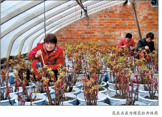 在位于邙山的天盛盆養(yǎng)牡丹園藝有限公司的日光溫室里,盡是郁郁蔥蔥的催花牡丹,其中不少已含苞待放。“羊年春節(jié)比往年晚一些,培育催花牡丹的時(shí)間更充分;再加上最近天氣不錯(cuò),所以今年牡丹長勢(shì)良好。”一名正在為牡丹抹藥的花農(nóng)說。