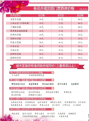 根據(jù)方案,自4月1日起至5月5日,洛陽各花卉觀賞園門票價格根據(jù)早花期、盛花期、晚花期三個時段實(shí)行彈性價格,住宿業(yè)客房標(biāo)準(zhǔn)間價格根據(jù)賓館、酒店的星級標(biāo)準(zhǔn)實(shí)行政府指導(dǎo)價。