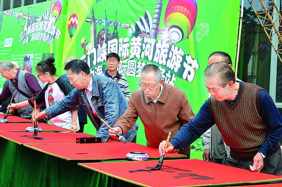 5月8日上午,由三門峽市文化藝術院、市游泳協(xié)會、中海國際銷售部共同舉辦的“增輝三門峽,獻禮旅游節(jié),添彩中國夢”系列活動在黃河公園東門西側廣場舉行。三門峽市18位書法家當場揮毫潑墨,為旅游節(jié)獻禮。