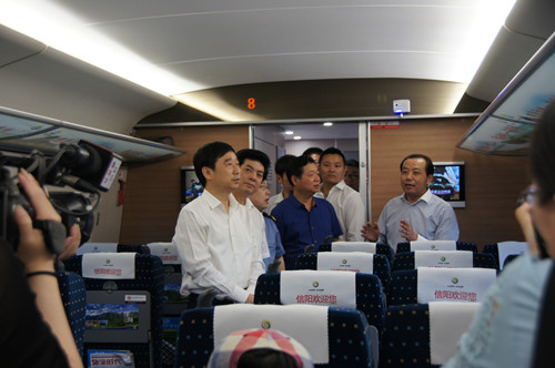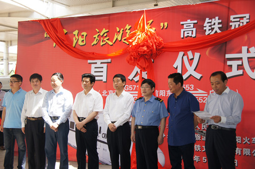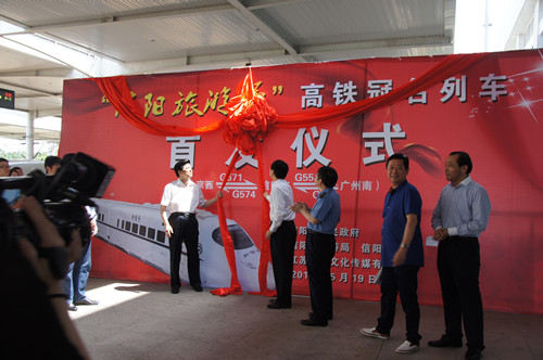 在5月19日第五個(gè)“中國旅游日”。“信陽旅游號(hào)”高鐵動(dòng)車冠名首發(fā)儀式在信陽東站舉行,信陽市長(zhǎng)喬新江、副市長(zhǎng)謝天學(xué)等市領(lǐng)導(dǎo)出席了首發(fā)儀式,并登車參觀。
