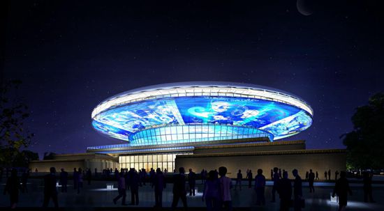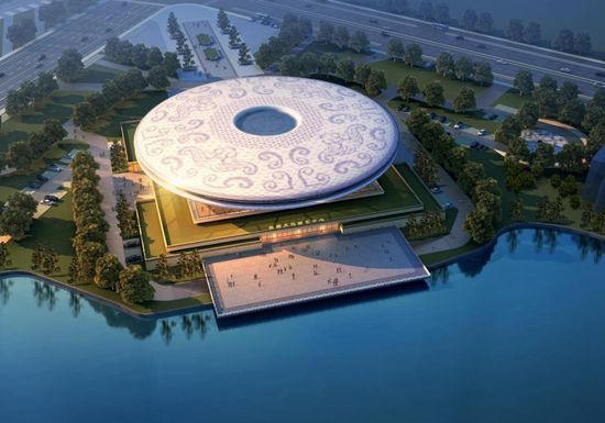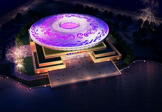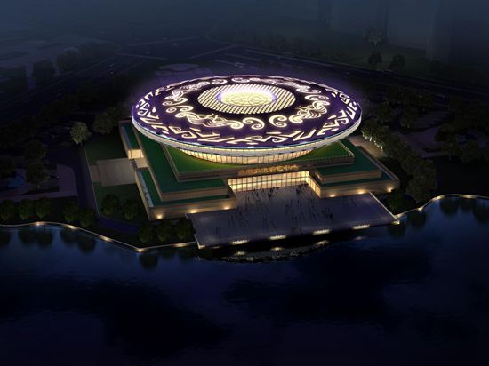 演藝中心外觀設(shè)計(jì)靈感來源于古代禮器中的玉璧和玉琮,夜晚時(shí)分,隨著燈光特效的不斷變化而展示出不同造型,打造出超一流的視覺奇觀。