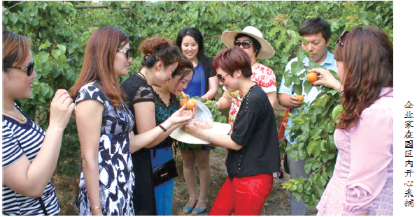 在朱薇的帶領下,企業(yè)家們來到生態(tài)果蔬種植區(qū)采摘黃杏。果樹上碩大的黃杏十分誘人,不一會兒,企業(yè)家們就滿載而歸。企業(yè)家高麗萍說:“這里的黃杏,個頭兒不僅比市場上的大,口感也更香甜。” 朱薇說,生態(tài)果蔬種植區(qū)種植的蘋果、桃子、梨、杏、西瓜、草莓、黃瓜、辣椒等果蔬,都是綠色有機食品,不使用任何違禁物質,足以讓顧客吃得放心。