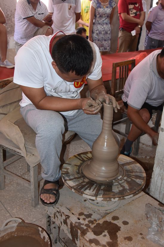 作為鈞瓷制作工藝中最古老的技法之一,手拉坯對(duì)手工操作的技巧性要求很高。在當(dāng)天的比賽中,來自神垕鎮(zhèn)38個(gè)鈞瓷窯口的40余名選手參加了比賽,他們都是鈞瓷燒制技藝項(xiàng)目代表性傳承人的徒弟。評(píng)委指定了千秋瓶、鵝頸瓶?jī)煞N器形,要求選手從中任選一種進(jìn)行拉坯創(chuàng)作。在快速旋轉(zhuǎn)的轉(zhuǎn)臺(tái)上,各位參賽選手抻拉點(diǎn)軋,一團(tuán)團(tuán)陶土逐漸展現(xiàn)出精美的造型,讓現(xiàn)場(chǎng)觀眾大開眼界。