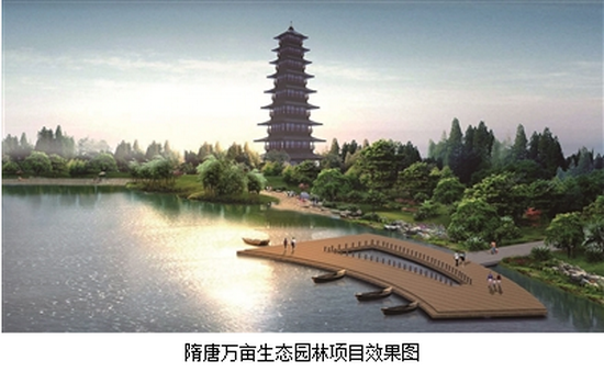 隋唐萬畝生態(tài)園林項目東起龍門大道,西至王城大道及解放路南延長線,北至洛河,南至古城路,總面積10750畝;建設(shè)以隋唐洛陽城遺址保護、旅游開發(fā)和文化展示為主要內(nèi)容的開放式市民休閑生態(tài)園林,打造在國內(nèi)有影響的隋唐文化、休閑觀光旅游目的地。