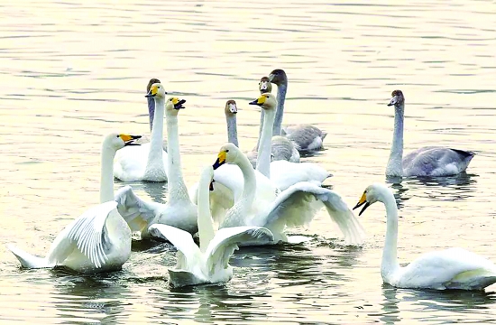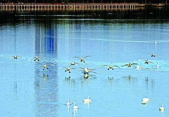 10月中旬,三三兩兩的白天鵝陸續(xù)回到了三門峽的家,與在三門峽留守的20多只白天鵝會(huì)合。到了28日,白天鵝的數(shù)量已經(jīng)迅速增加到了500余只。濕地公園管理處的工作人員告訴記者,隨著氣溫的轉(zhuǎn)冷,這個(gè)數(shù)字還將迅速擴(kuò)大。去年冬天,棲息生活在天鵝湖里的白天鵝一度超過1萬(wàn)只。