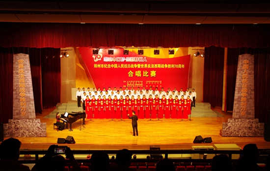為隆重紀(jì)念中國(guó)人民抗日戰(zhàn)爭(zhēng)勝利暨世界反法西斯戰(zhàn)爭(zhēng)勝利70周年,鄭州市委宣傳部、市直機(jī)關(guān)工委、市總工會(huì)、市公安局和市文廣新局等五部門聯(lián)合舉辦了“唱響中國(guó)夢(mèng)•出彩鄭州人”——鄭州市紀(jì)念中國(guó)人民抗日戰(zhàn)爭(zhēng)暨世界反法西斯戰(zhàn)爭(zhēng)勝利70周年合唱比賽,日前,比賽結(jié)果已經(jīng)揭曉,鄭州市旅游局代表隊(duì)?wèi){借扎實(shí)的唱功和良好的臺(tái)風(fēng)獲得合唱比賽一等獎(jiǎng)。