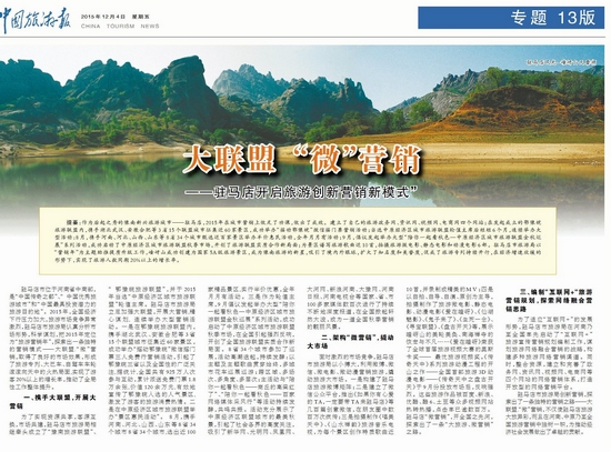 駐馬店市“大聯(lián)盟•微營銷”喜獲中國旅游營銷創(chuàng)新獎,2015年12月4日,《中國旅游報》以專題形式對《“大聯(lián)盟•微營銷”—駐馬店探索旅游創(chuàng)新營銷新模式》為主題進行了專版報道,對該市“大聯(lián)盟•微營銷”模式進行了解讀剖析。近年來,駐馬店市牽頭成立了“豫南七市旅游聯(lián)盟”、“鄂豫皖3省15市旅游聯(lián)盟”,參與創(chuàng)建了“一帶一路”城市旅游聯(lián)盟,并在2015年被推選為8省34個市參與的中原經(jīng)濟區(qū)旅游聯(lián)盟輪值主席單位,在該市積極努力推動下,“陪你一起看秋色—2015中原經(jīng)濟區(qū)城市旅游聯(lián)盟金秋巡展”,“陪你一起看秋色—商丘的高粱紅了”旅游采風活動,“七市聯(lián)動、合作共贏”豫南七市旅游聯(lián)盟戰(zhàn)略合作會議,第三屆山西(晉城)太行山文化旅游節(jié)等聯(lián)盟框架內(nèi)的旅游宣傳營銷等活動接二連三,異彩紛呈。同時,駐馬店市旅游局立足駐馬店旅游業(yè)發(fā)展的實際,創(chuàng)意拍攝了《愛在嵖岈》等5部原創(chuàng)旅游微電影,創(chuàng)作制作了《清靈銅山》、《薄山風情》等7首原創(chuàng)旅游風光MV,制作了全國首部3D旅游動漫電影《盤古開天》,引起旅游業(yè)界的高度關(guān)注和普遍認同,“大聯(lián)盟•微營銷”旅游創(chuàng)新營銷模式得到確立。