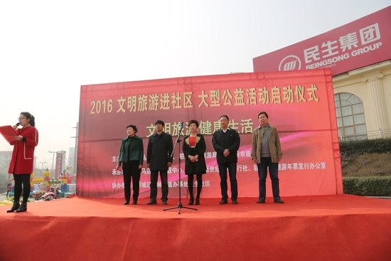 3月6日,由駐馬店市文明辦、駐馬店市旅游局、駐馬店市旅游協(xié)會共同主辦,駐馬店旅游集散中心、新世紀國際旅行社、駐馬店年票管理辦公室承辦的2016年度“文明旅游進社區(qū)”宣傳活動,在該市驛城區(qū)民生社區(qū)正式啟動;顒右“文明旅游•健康生活”為主題,倡導社區(qū)居民提升文明旅游意識,做文明公民、創(chuàng)文明城市。駐馬店市委宣傳部副部長、市文明辦主任劉雪和該市旅游局黨組書記、局長高峰出席啟動儀式并致辭,部分旅行社企業(yè)、民生社區(qū)工作人員和社區(qū)群眾近百人參加了活動。