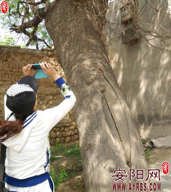 圖為4月24日,游客在該村具有300年樹(shù)齡的古槐樹(shù)下攝影留念。