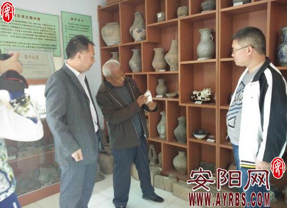 圖為漁洋村“土博士”龍振山(中)在自己創(chuàng)辦的漁洋文化遺址博物館向參觀者介紹漁洋文化。