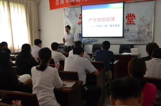 近日,濟源市旅游局舉行“兩學(xué)一做”學(xué)習(xí)教育專題輔導(dǎo)報告會,特邀市紀委第四檢查室主任趙中波同志作專題輔導(dǎo)報告,報告會以“嚴守黨的紀律”為主題。局黨組書記、局長許東方同志主持報告會。局機關(guān)黨委下屬各支部負責(zé)人、機關(guān)及下屬二級機構(gòu)全體黨員、部分旅游企業(yè)代表50余人參加了報告會。
