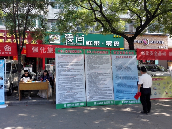 6月16日上午,駐馬店市旅游局在該市解放路中段參加了由駐馬店市政府安委會組織的安全生產(chǎn)咨詢?nèi)栈顒。此次活動秉?ldquo;強化旅游安全,享受快樂生活”主題,進(jìn)一步提高了廣大市民游客的旅游安全意識。