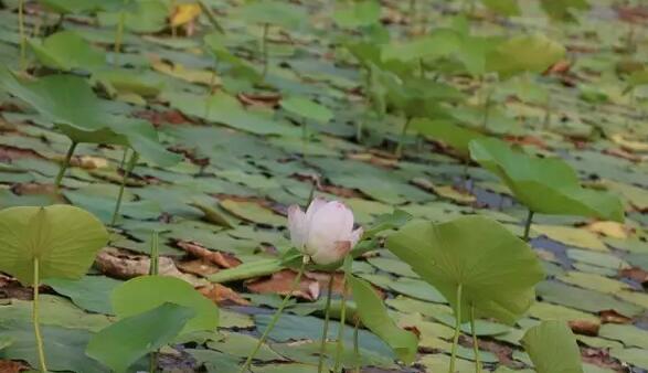 曾經(jīng)的西湖公園小西湖內(nèi)種植著不少荷花,但如今,因?yàn)槭杩:降赖仍,已很難見其蹤影。幸運(yùn)的是,6月20日下午,記者在西湖公園梅花堂前見到了僅存的一片荷花。