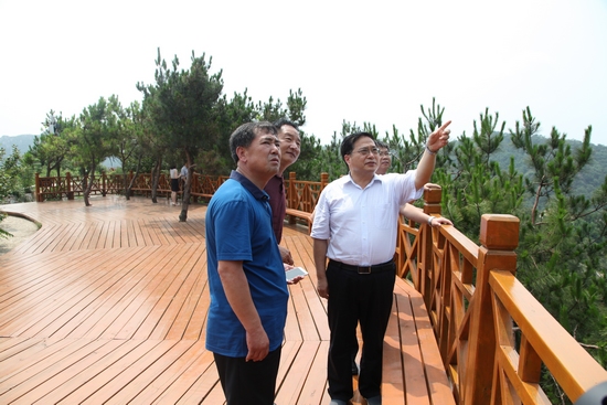 頂著烈日,冒著酷暑,李國勝副市長市長沿著蜿蜒山路前行,先后看了登山木棧道、重陽廣場、遇真宮和紫霄宮等山上基礎(chǔ)設(shè)施和古跡遺址復(fù)建項(xiàng)目,一路峰回路轉(zhuǎn),登高望遠(yuǎn),生態(tài)美景,盡收眼底。李市長指出,老樂山生態(tài)環(huán)境良好,山勢奇異、風(fēng)光旖旎,境內(nèi)青山綠水錦繡如畫、林壑幽美、鐘靈毓秀。人文資源豐富,原為道教福地,建有宮、觀,散落在山前山后,眾多古跡使人產(chǎn)生無限遐想,這是大自然和歷史賦予的寶貴財(cái)富,是駐馬店市旅游產(chǎn)業(yè)發(fā)展的靚麗名片,要充分珍惜資源特色,做大做強(qiáng)旅游產(chǎn)業(yè)。李市長指出,大樂山,大旅游,新突破,新起點(diǎn),一定要以發(fā)展的眼光定位景區(qū)的建設(shè),抓好景區(qū)規(guī)劃,規(guī)劃是景區(qū)開發(fā)建設(shè)的龍頭,要堅(jiān)持高標(biāo)準(zhǔn)、高起點(diǎn)規(guī)劃,圍繞國家5A級旅游景區(qū)的創(chuàng)建標(biāo)準(zhǔn),找準(zhǔn)定位,保護(hù)好生態(tài)環(huán)境,著力打造全國知名、省內(nèi)一流的生態(tài)旅游度假區(qū)。要豐富文化內(nèi)涵,突出文化特色,充分挖掘老樂山厚重文化,推動文化與旅游深度融合。要打造精品景區(qū),增強(qiáng)品牌意識,完善旅游服務(wù)體系,提升服務(wù)質(zhì)量,適應(yīng)自駕游、養(yǎng)生游、休閑游等旅游新業(yè)態(tài)發(fā)展需要,高質(zhì)量完成旅游基礎(chǔ)設(shè)施建設(shè),為早日申報(bào)國家5A級旅游景區(qū)而努力。