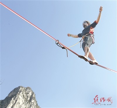 11月6日,2016云臺山“百米扁帶倒走速度最快”吉尼斯世界紀錄挑戰(zhàn)賽在焦作市云臺山景區(qū)紅石峽舉行,來自法國的扁帶選手桑松(譯名)在60米高空倒著走完100米長的扁帶,創(chuàng)造了6分01秒的吉尼斯世界紀錄。