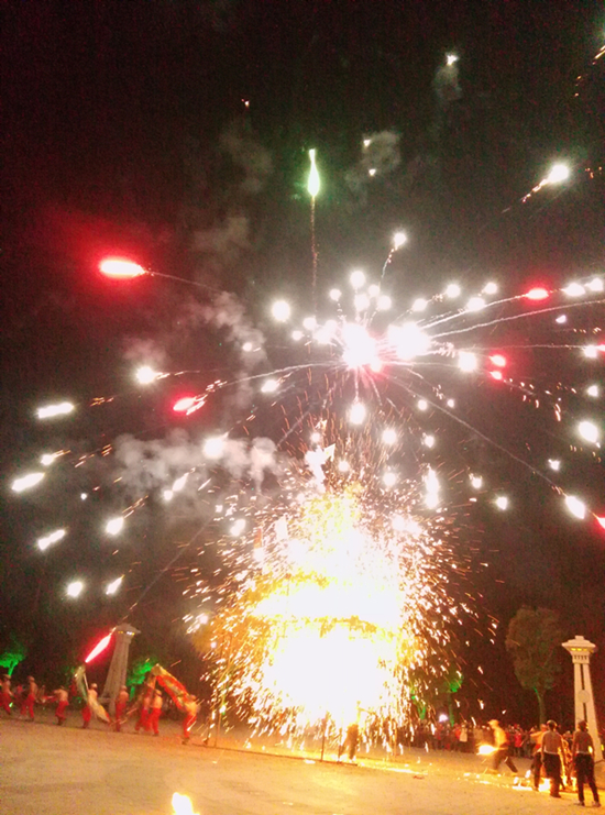 在鐵花表演之前,首先要舉行一個祈福儀式。打花藝人抬著十萬響的長鞭繞場一周,即是祭祀花棚和爐神,也是向四周觀眾致意。長鞭轟鳴,禮花騰空,巨龍長嘯,穿花過棚。鐵花藝人赤膊上陣,在高達1600多度的鐵花中施展絕技、來去自如,把一瓢鐵水倒在木柴上,瞬間燃起熊熊火焰,鐵花紛飛如天降瑞氣,落地生輝似黃金燦爛。煙花噴紅吐翠,鐵花流光溢彩,氣象萬千,美不勝收。打花者一棒接一棒,一人跟一人,往來于熔爐和花棚之間。一棒鐵花沖天而起,另一棒接踵而來,棒棒相連,絡繹不絕。鐵花飛濺,如火山噴發(fā),鞭炮齊鳴,似兩軍激戰(zhàn);齊火騰空,若萬鳥齊鳴,煙花噴涌,賽百花吐艷。壯士健步如飛,出沒于火海金濤之中;巨龍翻飛,穿梭于花棚之外;鐵瀑倒懸,流光溢彩,賞心悅目,驚心動魄。