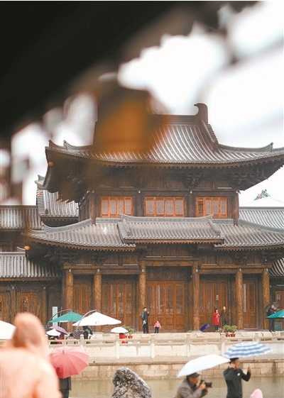 昨日,游客冒雨游園