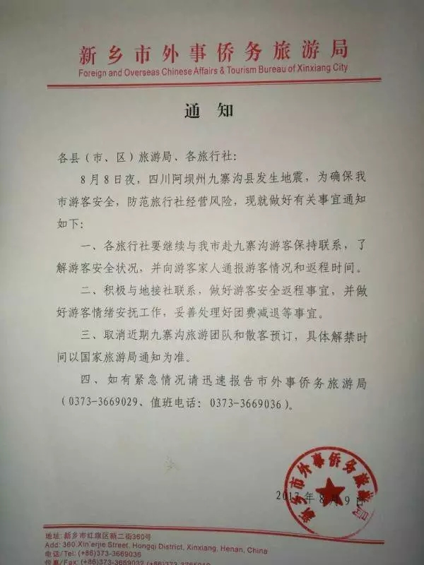 為確保新鄉(xiāng)市赴九寨溝游客旅途平安,防范旅行社經(jīng)營(yíng)風(fēng)險(xiǎn),市外事僑務(wù)旅游局就全市旅行社做好相關(guān)事宜提出了四點(diǎn)要求。一是各旅行社繼續(xù)與游客保持聯(lián)系,了解游客安全狀況,并向游客家屬通報(bào)游客情況和返程時(shí)間。二是積極與地接社聯(lián)系,做好安全返程事宜,并做好游客情緒安撫工作,妥善處理好團(tuán)費(fèi)減退等事宜。三是取消近期赴九寨溝旅游團(tuán)隊(duì)和散客預(yù)訂,具體解禁時(shí)間以國(guó)家旅游局通知為準(zhǔn)。四是如有緊急情況迅速報(bào)告市外事僑務(wù)旅游局(0373-3669029、值班電話:0373-3669036)。