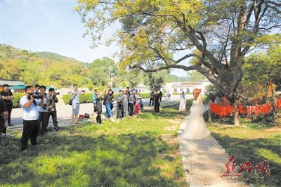 揭牌儀式過后,攝影師帶領(lǐng)7對(duì)新人到青龍峽景區(qū)“中國(guó)愛情第一村”、千年榔榆林等景點(diǎn)選景拍照。不論是青龍峽景區(qū)“陪嫁妝村”的愛情典故,還是景區(qū)初秋的山水美景,都讓這些新人流連忘返,紛紛表示不虛此行。“這次拍的婚紗照是最珍貴的紀(jì)念品,如果我們能在這里舉辦婚禮,就更完美啦!”參加此次新人婚紗照拍攝的李先生說。
