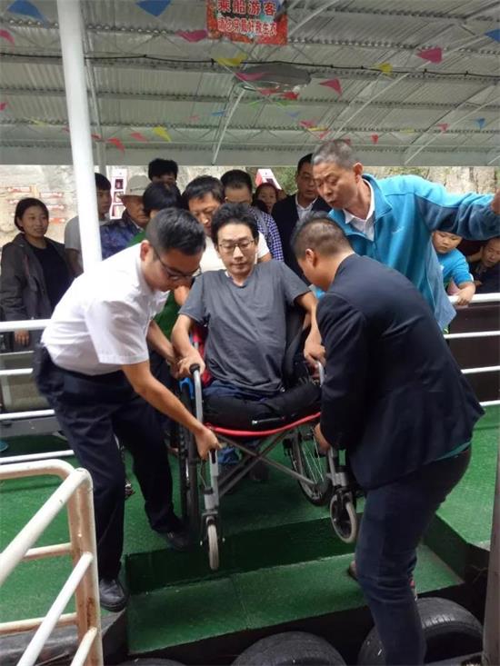 臨近中午時分,景區(qū)游船檢票處的工作人員發(fā)現(xiàn)高位截癱的劉先生即將檢票乘船,但是離登船臺還有的一段距離的臺階,于是檢票處的工作人員和執(zhí)勤武警官兵便主動上前幫忙將劉先生順利送達船臺并登上游船。上船時,工作人員又熱情的幫忙將劉先生抬上游船,景區(qū)工作人員的一系列暖心的舉動獲得了劉先生及現(xiàn)場游客的一致好評。