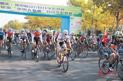 9時整,隨著一聲清脆的發(fā)令槍響,幾百名參加公路車精英賽男子組48公里比賽的選手們率先沖出起跑線。只見選手們頭戴安全盔、身著騎行服,一個個猶如離弦之箭,在圍觀游客的歡呼聲中展開激烈競技。