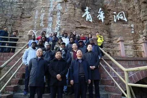 參觀過紀念館后,中非媒體采訪團來到青年洞景區(qū),與紅旗渠工程零距離接觸,沿渠體驗當(dāng)年修渠民工的艱辛不易,仰望“山碑”,并在青年洞前集體合影。