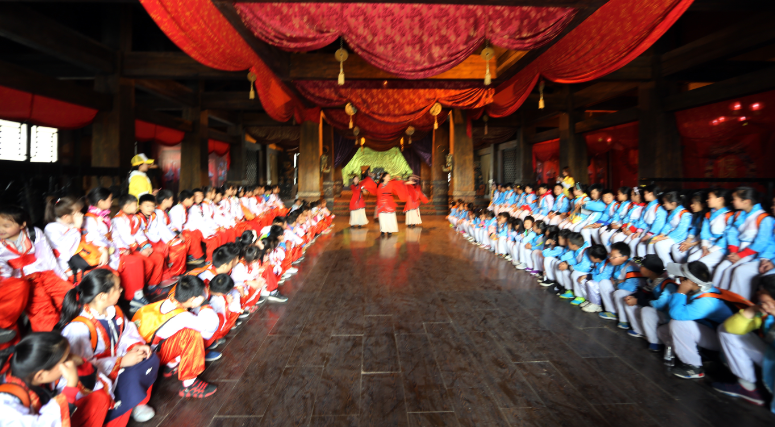 于此同時,恰逢《武宗滅佛》拍攝正酣,國學(xué)古裝之旅和影視劇拍攝來了一次特別的碰撞,大部分孩子們都是第一次走進拍攝現(xiàn)場,充分了解了熒屏上電視劇在幕后是怎樣拍攝的,一次影視拍攝揭秘讓孩子們興奮不已。 焦作影視城特別為孩子們準備了《自相矛盾》、《鄭人買履》、《桃殺三士》等景點歷史劇目展演,讓孩子們在觀賞歷史劇目的同時真正了解日常所學(xué)成語的出處和典故.