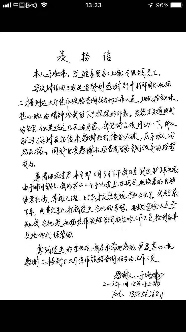 11月9日下午,一位來自上海的于先生,出差到達新鄭機場,由于時間匆忙,把手機遺忘在購買地鐵票的自助售票機旁,這時候,剛好機場焦作旅游咨詢臺的工作人員范茹萍和孟妍妍下班去坐地鐵,看到了于先生遺失的手機,于是她倆人就把手機交給了地鐵安檢人員,方才離去。于先生進站上車,才發(fā)現(xiàn)手機不見了,他連忙下車尋找,用其它手機打到遺失手機的號碼上,地鐵安檢人員告訴他,手機是機場焦作旅游咨詢臺的工作人員撿到后,交給他們保管的,于先生拿到遺失的手機后,非常的感動,回家以后就寫下了這封表揚信,真心的感謝機場焦作旅游咨詢臺的工作人員。