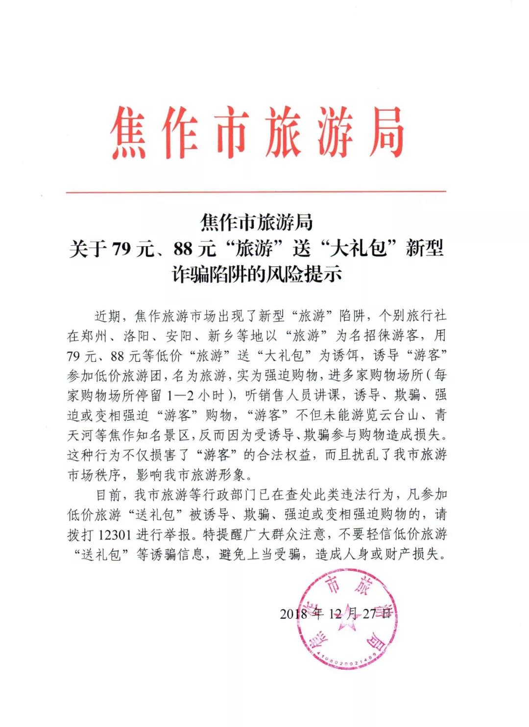焦作市旅游局關(guān)于79元、88元“旅游”送“大禮包”新型詐騙陷阱的風險提示